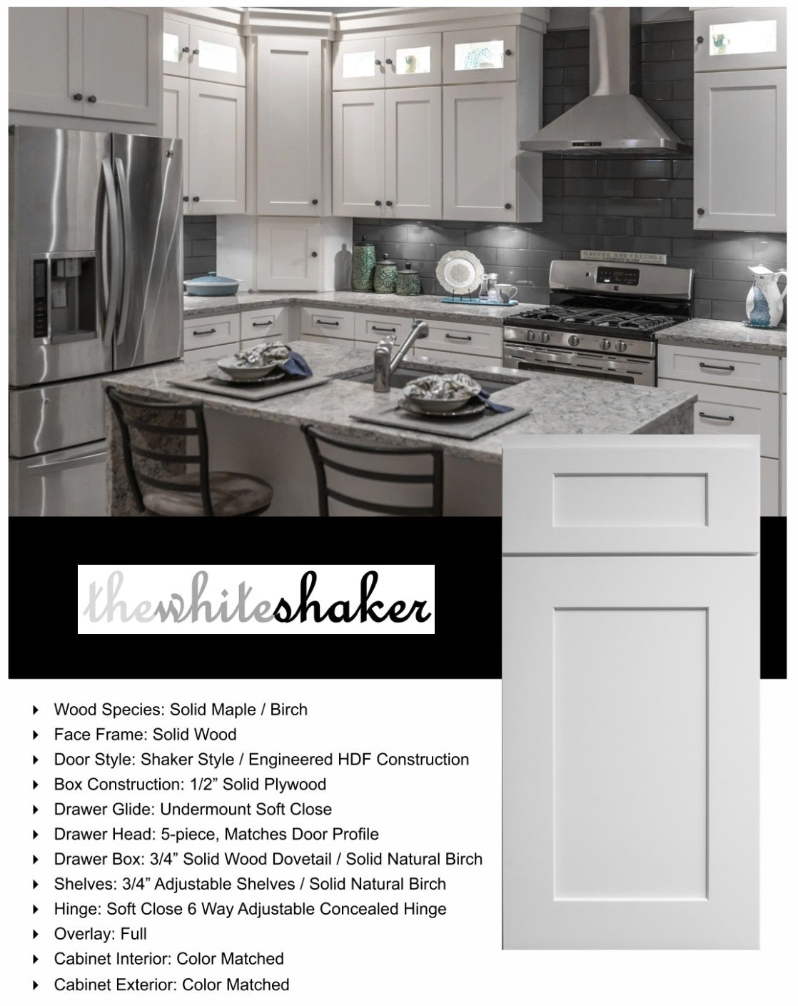 Whether they are for your kitchen, bathroom, laundry room, garage, bar area or anywhere else in your home, our premium ready-to-assemble line of elegant white shaker cabinets will meet and surpass your needs.